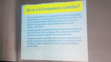 Astăzi, 26.09.2017 am sărbătorit Ziua europeană a limbilor străine în cadrul unei activități organizate în școala noastră împreună cu elevi din clasele a V-a A, a VI-a A, a VIII-a B și a V-a C. Aceștia au pregătit numeroase materiale interesante, pe care le-au prezentat colegilor din alte clase gimnaziale. Prezentările power-point și posterele au oferit informații despre diferite limbi precum și despre țările în care acestea sunt vorbite. Elevii au avut astfel ocazia să își îmbogățească cunoștințele cu diverse curiozități, proverbe, saluturi și urări în limbile: engleză, franceză, greacă, italiană, germană, maghiară, spaniolă și arabă.
